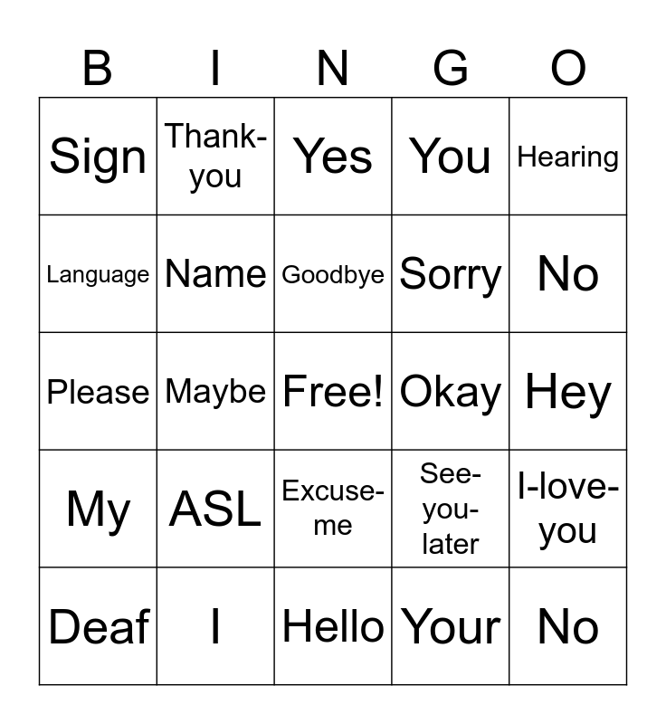 This bingo card has a free space and 25 words: ASL, Hello, Goodbye, Deaf, Hearing, Sign, Language, Thank-you, Okay, Excuse-me, Sorry, Please, See-you-later, I-love-you, Name, With, Hey, Yes, No, Maybe, No, I, My, You and Your.
