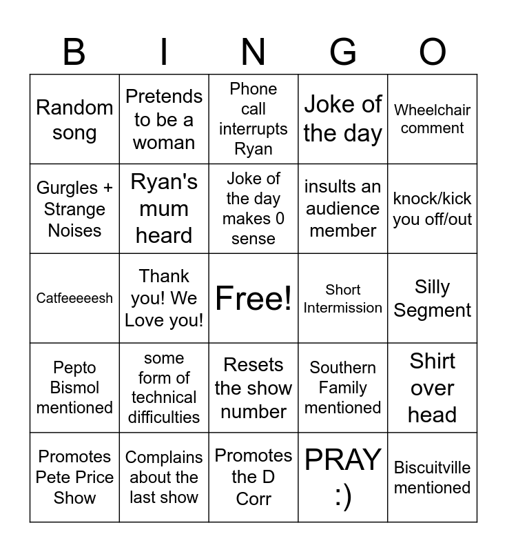This bingo card has a free space and 27 words: ORG Mentioned, Complains about the last show, Joke of the day makes 0 sense, PRAY :), Wheelchair comment, Gurgles + Strange Noises, Pretends to be a woman, Promotes the D Corr, Short Intermission, Shirt over head, Pepto Bismol mentioned, Ryan's mum heard, Southern Family mentioned, Biscuitville mentioned, Catfeeeeesh, Political rant (Good or Bad), Phone call interrupts Ryan, Joke of the day, Silly Segment, Random song, some form of technical difficulties, Resets the show number, insults an audience member, knock/kick you off/out, Promotes Pete Price Show, Thank you! We Love you! and thumbs up/fist to the audience.