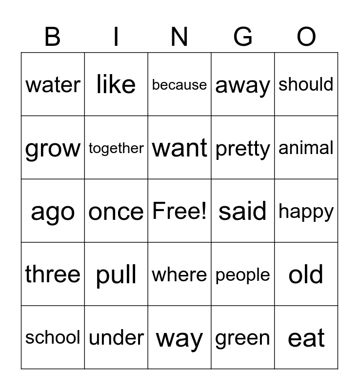 This bingo card has a free space and 25 words: pull, way, want, school, should, water, grow, like, said, where, pretty, ago, people, old, together, around, happy, because, animal, once, eat, under, three, away and green.