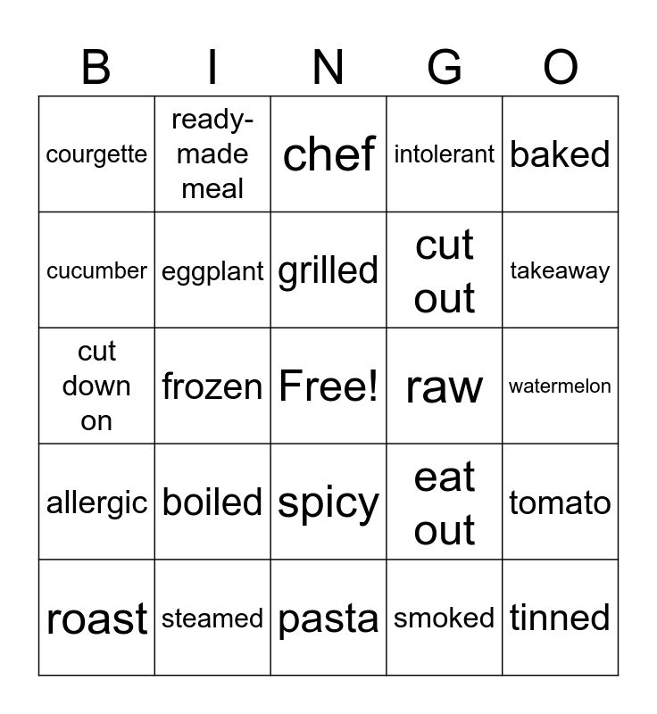 This bingo card has a free space and 24 words: boiled, steamed, grilled, roast, baked, courgette, cucumber, ready-made meal, raw, spicy, cut out, cut down on, eat out, tomato, eggplant, smoked, watermelon, chef, takeaway, frozen, tinned, allergic, intolerant and pasta.