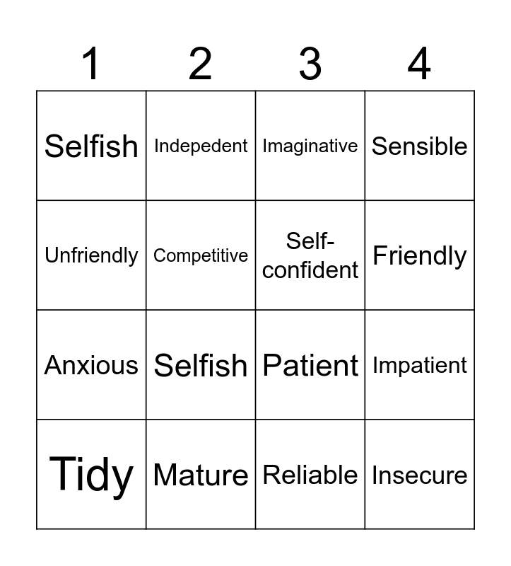 This bingo card has 28 words: Ambitious, Charming, Anxious, Honest, Competitive, Imaginative, Indepedent, Insecure, Mature, Moody, Patient, Sensible, Sociable, Stubborn, Selfish, Rebellious, Sensitive, Self-confident, Friendly, Kind, Selfish, Organized, Tidy, Impatient, Reliable, Dishonest, Unfriendly and Sympathetic.