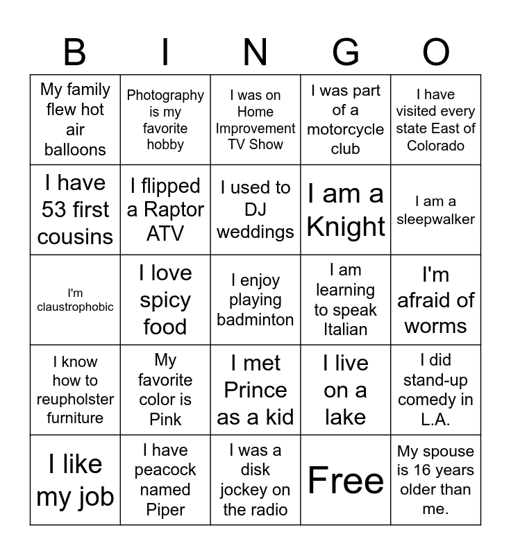 This bingo card has 28 words: I did stand-up comedy in L.A., I can do tattoos, I am a Knight, Free, I have 53 first cousins, I was on Home Improvement TV Show, Photography is my favorite hobby, I know how to reupholster furniture, I am learning to speak Italian, I like my job, I'm claustrophobic, I was part of a motorcycle club, I have peacock named Piper, I was a disk jockey on the radio, I am a sleepwalker, I had a black dog named Kujo, My favorite color is Pink, I flipped a Raptor ATV, I used to DJ weddings, I met Prince as a kid, My family flew hot air balloons, My spouse is 16 years older than me., I enjoy playing badminton, I love spicy food, I'm afraid of worms, I live on a lake, I have visited every state East of Colorado and I've flown in a private jet.