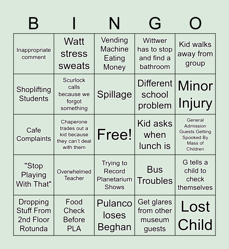 This bingo card has a free space and 49 words: Chaperone is late with groip, Lost Child, Running late, Pulanco loses Beghan, Overwhelmed Teacher, Kid asks museum employeee dumb question, Watt stress sweats, Someone asks to go to the bathroom halfway on the bus, Shoplifting Students, Gay says baby exasperatedly, Scurlock calls because we forgot something, Wittwer has to stop and find a bathroom, G tells a child to check themselves, Bus Troubles, Bus sick on pulanco bus, Kid gets an attitude with chaperone, Spillage, Kid asks when lunch is, Kids act like they’ve never seen the real world, Kid walks away from group, Chaperone trades out a kid because they can’t deal with them, Get glares from other museum guests, Inappropriate comment, Different school problem, Climbing On Sundial, Minor Injury, Dropping Stuff From 2nd Floor Rotunda, Shoes On Seats in PLA, Trying to Record Planetarium Shows, "Stop Playing With That", Jumping/Stomping on Glass Tiles, Rampaging through Rotunda, M.I.A During Seating, Coffee Inquiries, Food Check Before PLA, Chaperone Cash Checking a Child, Attention Seekers on the 2nd Floor, Voicemail/Calls from Late Schools, General Admission Guests Getting Spooked By Mass of Children, Switching From Running to Skipping, Change For Penny Press, "Did You Pay For That?", Angela Sass, Chaperone Bringing Other Offspring, Cafe Complaints, Vending Machine Eating Money, Kids Entering with a "Woah!", Kids Bragging about Having Been Here Before and Kids Sitting on Non-Seat Objects.