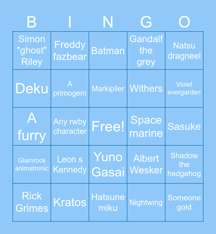This bingo card has a free space and 24 words: Leon s Kennedy, Kratos, Markiplier, Rick Grimes, Natsu dragneel, Simon "ghost" Riley, Deku, Freddy fazbear, Space marine, Yuno Gasai, Withers, A furry, Albert Wesker, Shadow the hedgehog, A primogem, Nightwing, Sasuke, Batman, Violet evergarden, Any rwby character, Someone gold, Glamrock animatronic, Gandalf the grey and Hatsune miku.