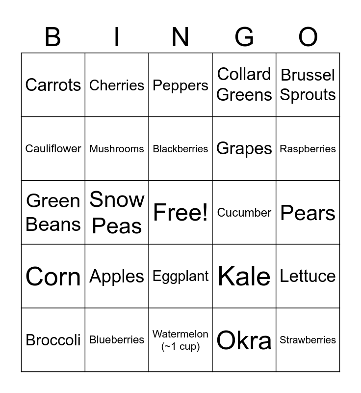This bingo card has a free space and 24 words: Apples, Blueberries, Blackberries, Broccoli, Brussel Sprouts, Carrots, Cauliflower, Cherries, Cucumber, Eggplant, Grapes, Green Beans, Kale, Lettuce, Mushrooms, Okra, Pears, Peppers, Raspberries, Snow Peas, Strawberries, Corn, Collard Greens and Watermelon (~1 cup).