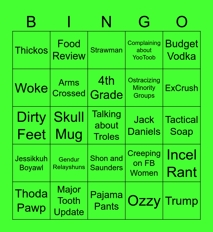 This bingo card has a free space and 24 words: Thoda Pawp, Gendur Relayshuns, 4th Grade, Ozzy, Budget Vodka, Thickos, Food Review, Strawman, Jack Daniels, Tactical Soap, Dirty Feet, Arms Crossed, Creeping on FB Women, Incel Rant, Woke, Major Tooth Update, Pajama Pants, Complaining about YooToob, ExCrush, Jessikkuh Boyawl, Skull Mug, Shon and Saunders, Ostracizing Minority Groups and Trump.