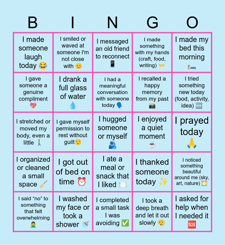 This bingo card has 25 words: I got out of bed on time โฐ, I completed a small task I was avoiding โ , I had a meaningful conversation with someone today ๐ฃ๏ธ, I said โnoโ to something that felt overwhelming ๐ โโ๏ธ, I made my bed this morning ๐๏ธ, I made someone laugh today ๐, I gave someone a genuine compliment ๐, I smiled or waved at someone I'm not close with ๐, I enjoyed a quiet moment โ, I ate a meal or snack that I liked ๐ฝ๏ธ, I recalled a happy memory from my past ๐ธ, I stretched or moved my body, even a little ๐ถโโ๏ธ, I thanked someone today โจ, I noticed something beautiful around me (sky, art, nature) ๐ , I drank a full glass of water ๐ง, I asked for help when I needed it ๐, I prayed today ๐, I messaged an old friend to reconnect ๐ฑ, I tried something new today (food, activity, idea) ๐, I gave myself permission to rest without guilt๐, I hugged someone or myself ๐ซ, I washed my face or took a shower ๐ฟ, I organized or cleaned a small space ๐งน, I made something with my hands (craft, food, writing) ๐ and I took a deep breath and let it out slowly ๐ฎโ๐จ.