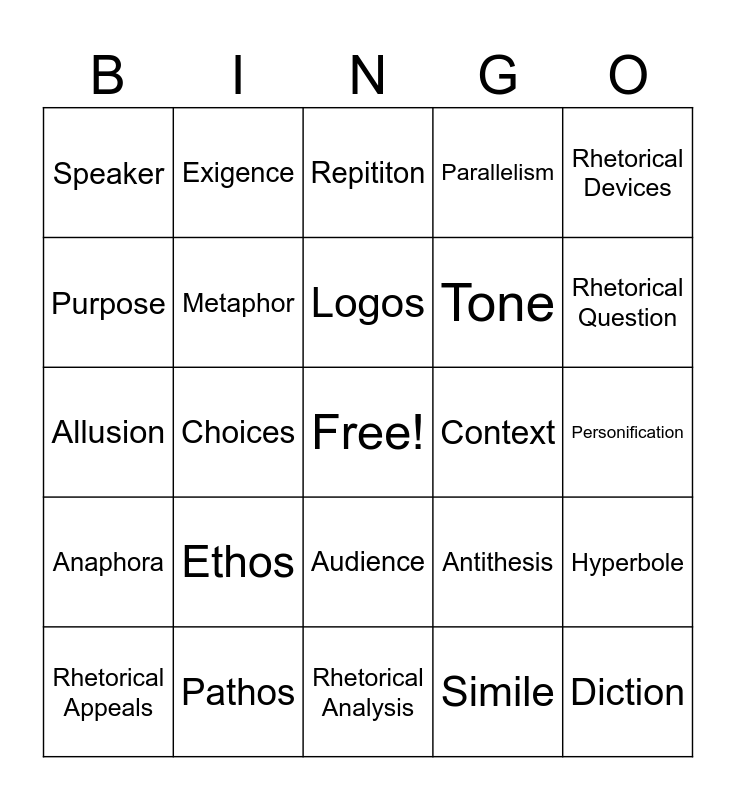 This bingo card has a free space and 24 words: Ethos, Pathos, Logos, Rhetorical Appeals, Rhetorical Devices, Speaker, Purpose, Exigence, Context, Audience, Tone, Allusion, Antithesis, Hyperbole, Metaphor, Simile, Personification, Repititon, Rhetorical Question, Choices, Diction, Anaphora, Parallelism and Rhetorical Analysis.