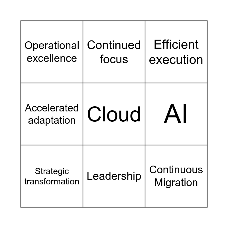 This bingo card has a free space and 9 words: Strategic transformation, Efficient execution, Continued focus, Accelerated adaptation, Operational excellence, AI, Continuous Migration, Closer leadership and Leadership.