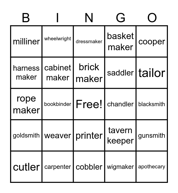 This bingo card has a free space and 24 words: weaver, carpenter, brick maker, cutler, cooper, milliner, harness maker, wheelwright, chandler, printer, saddler, rope maker, tavern keeper, gunsmith, cabinet maker, wigmaker, blacksmith, dressmaker, tailor, bookbinder, apothecary, goldsmith, basket maker and cobbler.