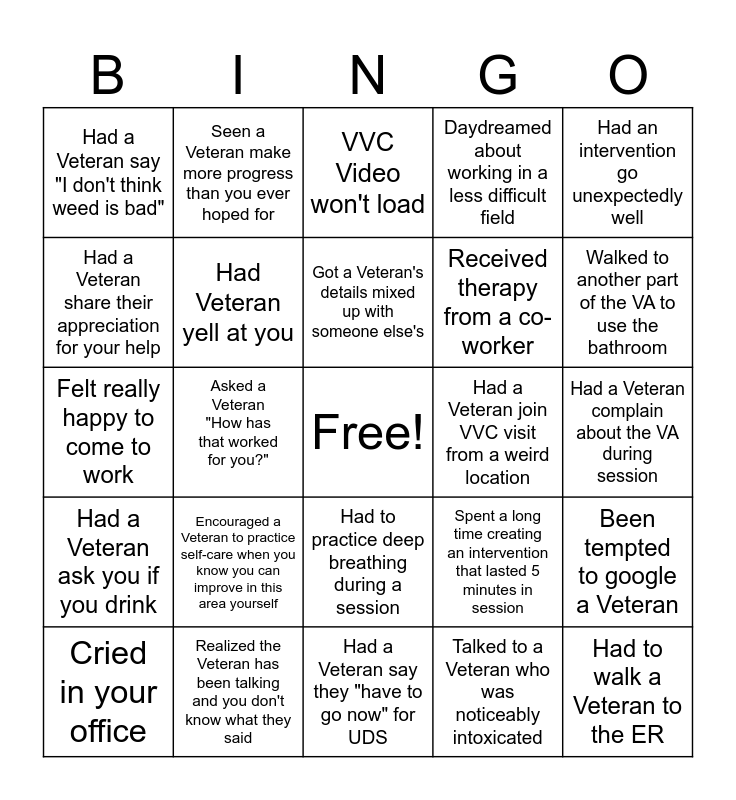 This bingo card has a free space and 31 words: Had a Veteran say they "have to go now" for UDS, Asked a Veteran "How do you feel about that", Asked a Veteran "How has that worked for you?", Had a Veteran report DOLU "this morning" during check-in, Had a Veteran say "I don't think weed is bad", VVC Video won't load, Had Veteran yell at you, Spent a long time creating an intervention that lasted 5 minutes in session, Had a Veteran join VVC visit from a weird location, Talked to a Veteran who was noticeably intoxicated, Had a Veteran complain about the VA during session, Had to walk a Veteran to the ER, Had a Veteran's pet photobomb a VVC visit, Had your own pet photobomb a VVC visit, Walked to another part of the VA to use the bathroom, Walked to another part of the VA to get water, Been tempted to google a Veteran, Encouraged a Veteran to practice self-care when you know you can improve in this area yourself, Had a Veteran ask you if you drink, Had to practice deep breathing during a session, Had an intervention go unexpectedly well, Been secretly happy about a no-show or cancellation, Cried in your office, Seen a Veteran make more progress than you ever hoped for, Received therapy from a co-worker, Had a Veteran share their appreciation for your help, Daydreamed about working in a less difficult field, Felt really happy to come to work, Realized the Veteran has been talking and you don't know what they said, Got a Veteran's details mixed up with someone else's and Had a Veteran talk excessively during an assessment.