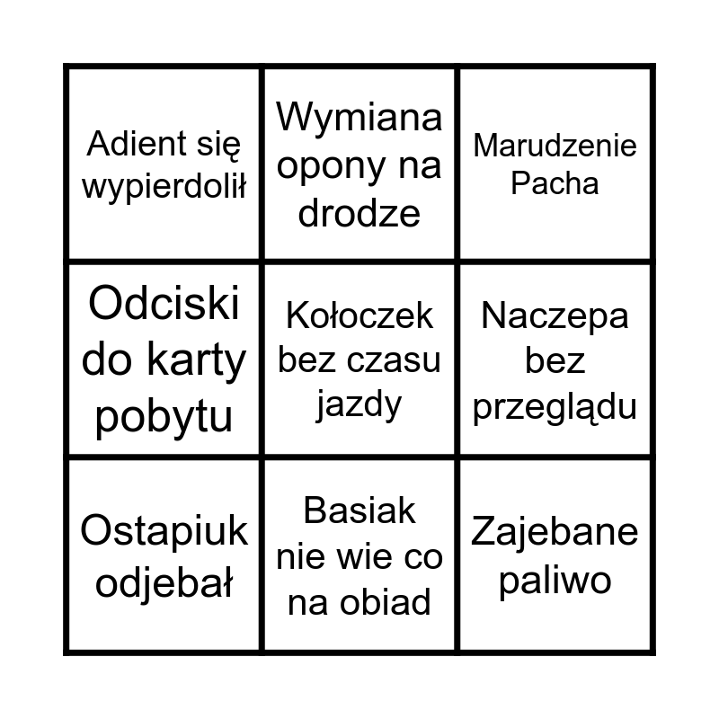 This bingo card has a free space and 8 words: Naczepa bez przeglądu, Marudzenie Pacha, Wymiana opony na drodze, Ostapiuk odjebał, Adient się wypierdolił, Zajebane paliwo, Odciski do karty pobytu and Basiak nie wie co na obiad.