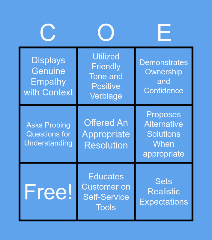This bingo card has a free space and 9 words: Free!, Demonstrates Ownership and Confidence, Utilized Friendly Tone and Positive Verbiage, Asks Probing Questions for Understanding, Displays Genuine Empathy with Context, Proposes Alternative Solutions When appropriate, Sets Realistic Expectations, Offers Further Assistance to Close Interaction and Educates Customer on Self-Service Tools.
