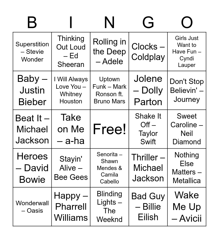 This bingo card has a free space and 74 words: Bohemian Rhapsody – Queen, Billie Jean – Michael Jackson, Rolling in the Deep – Adele, Smells Like Teen Spirit – Nirvana, Hotel California – Eagles, Shape of You – Ed Sheeran, Material Girl – Madonna, Sweet Child O' Mine – Guns N' Roses, Wonderwall – Oasis, Dancing Queen – ABBA, Paint it Black – The Rolling Stones, Livin' on a Prayer – Bon Jovi, Uptown Funk – Mark Ronson ft. Bruno Mars, Baby – Justin Bieber, Hallelujah – Leonard Cohen, Take on Me – a-ha, Let It Be – The Beatles, Don't Stop Believin' – Journey, Temperature – Sean Paul, Beat It – Michael Jackson, I Will Always Love You – Whitney Houston, Thinking Out Loud – Ed Sheeran, Clocks – Coldplay, Let Me Entertain You – Robbie Williams, Wake Me Up – Avicii, Every Breath You Take – The Police, My Heart Will Go On – Celine Dion, Can't Stop the Feeling! – Justin Timberlake, We Are the Champions – Queen, Somebody That I Used to Know – Gotye, Girls Just Want to Have Fun – Cyndi Lauper, Chandelier – Sia, Like a Rolling Stone – Bob Dylan, Eye of the Tiger – Survivor, Counting Stars – OneRepublic, Bad Guy – Billie Eilish, Cheap Thrills – Sia, All Star – Smash Mouth, Seven Nation Army – The White Stripes, Skyfall – Adele, Blinding Lights – The Weeknd, Happy – Pharrell Williams, Africa – Toto, Lose Yourself – Eminem, The Sound of Silence – Simon & Garfunkel, Superstition – Stevie Wonder, Take Me Home, Country Roads – John Denver, Stayin' Alive – Bee Gees, Born to Run – Bruce Springsteen, Hotline Bling – Drake, Riptide – Vance Joy, Royals – Lorde, Sweet Caroline – Neil Diamond, Time After Time – Cyndi Lauper, Umbrella – Rihanna ft. Jay-Z, Valerie – Amy Winehouse, Senorita – Shawn Mendes & Camila Cabello, Radioactive – Imagine Dragons, Don't Start Now – Dua Lipa, Nothing Else Matters – Metallica, Jolene – Dolly Parton, Crazy in Love – Beyoncé, Heroes – David Bowie, Castle on the Hill – Ed Sheeran, Shake It Off – Taylor Swift, The Scientist – Coldplay, Somebody to Love – Queen, Torn – Natalie Imbruglia, Thriller – Michael Jackson, Summer of '69 – Bryan Adams, Creep – Radiohead, Poker Face – Lady Gaga, A Thousand Miles – Vanessa Carlton and Titanium – David Guetta ft. Sia.