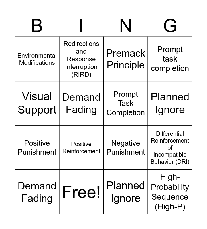 This bingo card has 25 words: Extinction, Negative Reinforcement, Planned Ignore, Choice Making, Visual Support, Environmental Modifications, Demand Fading, Redirections and Response Interruption (RIRD), Free!, Priming, Positive Punishment, Negative Punishment, Behavior Momentum, Differential Reinforcement of Alternative Behavior (DRA), Prompt Task Completion, Functional Communication Teaching (FCT), Planned Ignore, Premack Principle, Positive Reinforcement, Differential Reinforcement of Incompatible Behavior (DRI), Demand Fading, Differential Reinforcement of Other Behavior (DRO), High-Probability Sequence (High-P), Prompt task completion and Pairing.