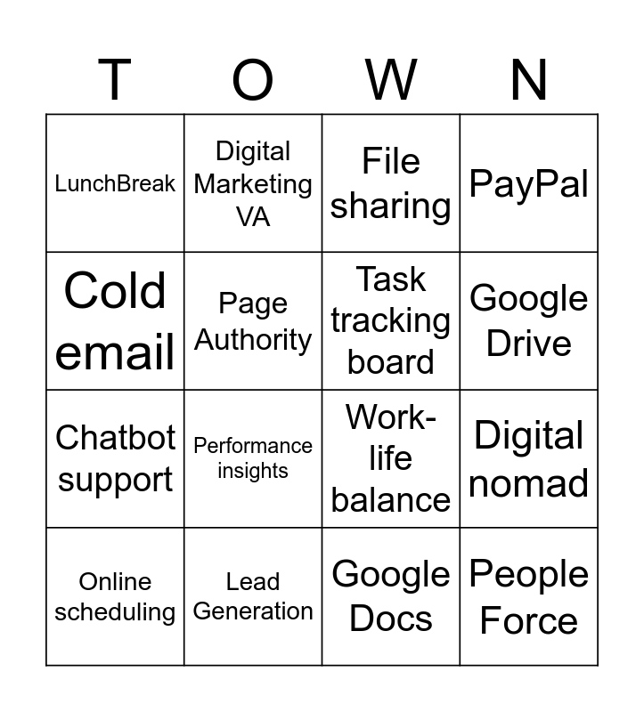 This bingo card has 16 words: Lead Generation, Digital nomad, File sharing, LunchBreak, Chatbot support, Digital Marketing VA, Work-life balance, Google Docs, Cold email, Page Authority, Online scheduling, PayPal, Performance insights, Google Drive, Task tracking board and People Force.