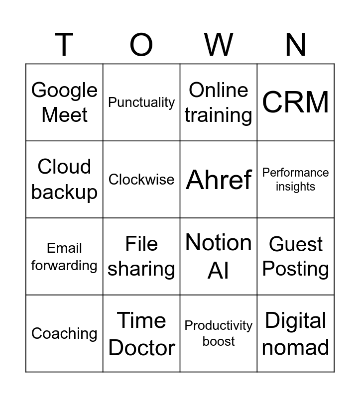 This bingo card has 16 words: Time Doctor, Guest Posting, Online training, Google Meet, Email forwarding, Punctuality, Notion AI, Productivity boost, Cloud backup, Clockwise, Coaching, CRM, File sharing, Performance insights, Ahref and Digital nomad.