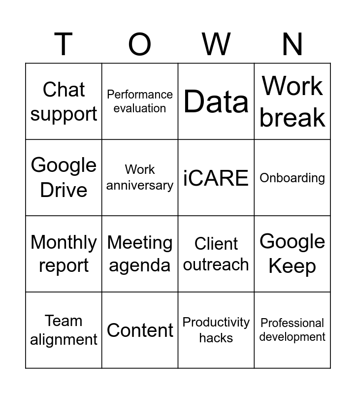 This bingo card has 16 words: Content, Google Keep, Data, Chat support, Monthly report, Performance evaluation, Client outreach, Productivity hacks, Google Drive, Work anniversary, Team alignment, Work break, Meeting agenda, Onboarding, iCARE and Professional development.