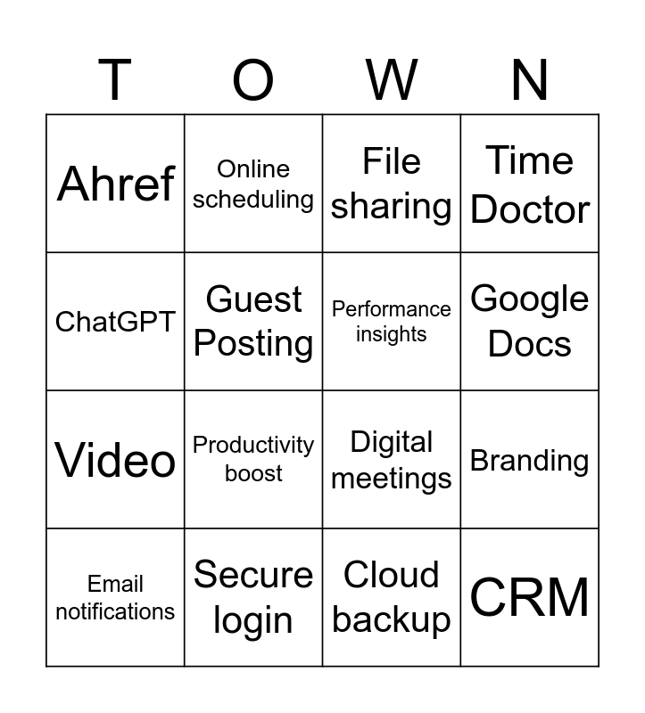 This bingo card has 16 words: Secure login, Branding, File sharing, Ahref, Video, Online scheduling, Digital meetings, Cloud backup, ChatGPT, Guest Posting, Email notifications, Time Doctor, Productivity boost, Google Docs, Performance insights and CRM.