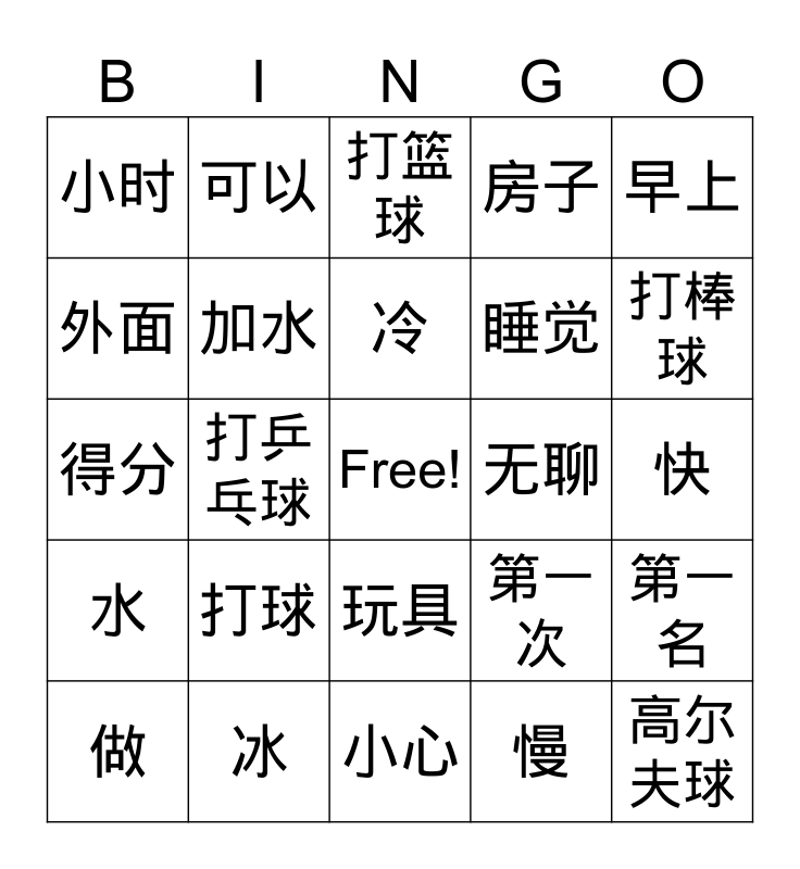 This bingo card has a free space and 24 words: 打球, 冰, 冷, 做, 早上, 小时, 外面, 可以, 无聊, 玩具, 睡觉, 得分, 第一次, 第一名, 加水, 慢, 快, 打篮球, 打棒球, 打乒乓球, 高尔夫球, 水, 房子 and 小心.