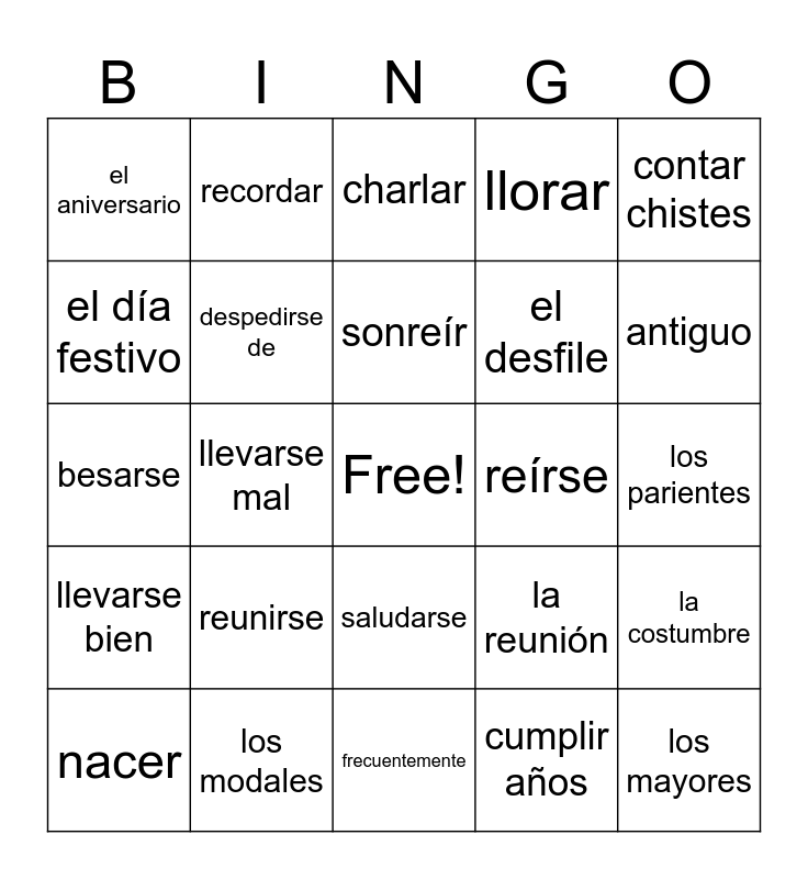 This bingo card has a free space and 40 words: abrazarse, besarse, darse la mano, despedirse de, los modales, saludarse, sonreír, el bebé, contar chistes, llevarse bien, llevarse mal, llorar, los mayores, los parientes, reírse, reunirse, alrededor de, el aniversario, casarse con, charlar, la costumbre, cumplir años, el desfile, el día festivo, divertirse, enorme, ¡Felicidades!, felicitar, la fiesta de sorpresa, los fuegos artificiales, hacer un picnic, nacer, regalar, la reunión, antiguo, frecuentemente, había, mientras que, recordar and el chisme.
