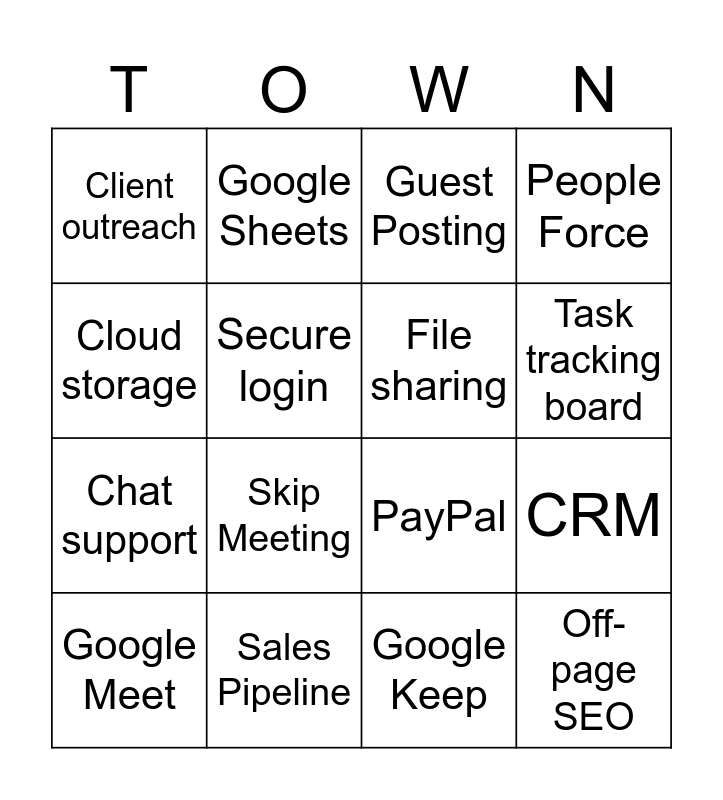 This bingo card has 16 words: Sales Pipeline, CRM, Guest Posting, Client outreach, Chat support, Google Sheets, PayPal, Google Keep, Cloud storage, Secure login, Google Meet, People Force, Skip Meeting, Task tracking board, File sharing and Off-page SEO.