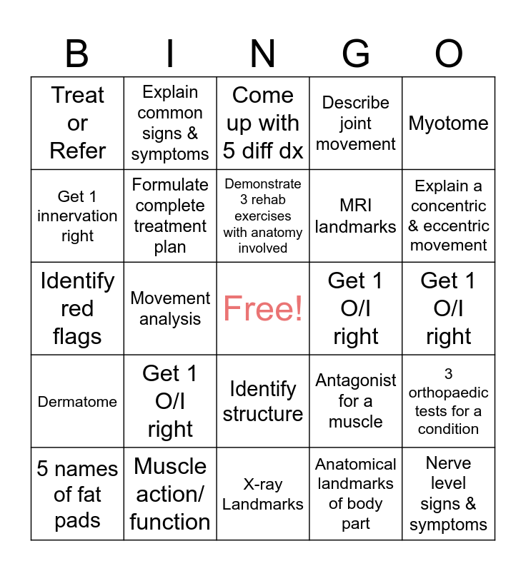 This bingo card has a free space and 24 words: Get 1 O/I right, Muscle action/ function, Demonstrate 3 rehab exercises with anatomy involved, 5 names of fat pads, Myotome, Treat or Refer, Get 1 innervation right, Explain common signs & symptoms, Get 1 O/I right, Identify structure, MRI landmarks, Identify red flags, Antagonist for a muscle, 3 orthopaedic tests for a condition, Formulate complete treatment plan, Anatomical landmarks of body part, Get 1 O/I right, Come up with 5 diff dx, Explain a concentric & eccentric movement, Movement analysis, Nerve level signs & symptoms, Dermatome, Describe joint movement and X-ray Landmarks.