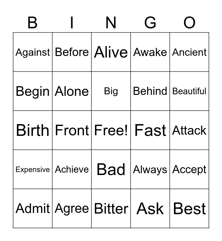 This bingo card has a free space and 24 words: Achieve, Agree, Big, Admit, Ancient, Against, Begin, Before, Fast, Bad, Behind, Birth, Always, Accept, Alone, Ask, Attack, Alive, Beautiful, Front, Best, Expensive, Awake and Bitter.