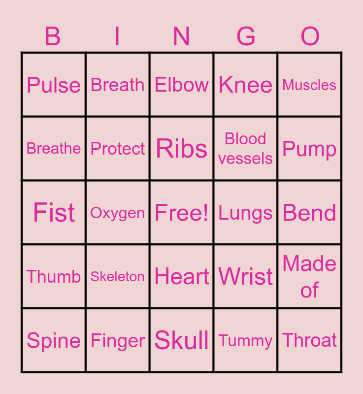 This bingo card has a free space and 25 words: Skeleton, Skull, Ribs, Spine, Muscles, Pulse, Breathe, Breath, Lungs, Heart, Blood vessels, Fist, Wrist, Made of, Protect, Twist, Bend, Elbow, Pump, Oxygen, Throat, Finger, Thumb, Knee and Tummy.