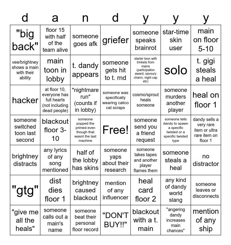 This bingo card has a free space and 60 words: "give me all the heals", someone calls out a main's name, dandy gave heals, "DON'T BUY!!", someone speaks brainrot, any kind of dandy world slang, main on floor 5-10, t. glis. goes crazy, main toon in lobby, brightney caused blackout, griefer, heal card floor 2, star-time skin user, no distractor, "gtg", floor 15 with half of the team alive, someone goes afk, someone gets hit to t. rnd, blackout with a t. main, solo, t. gigi steals a heal, vee/brightney shows a main with their ability, dist dies floor 1, t. dandy appears, rnd distracts, someone steals a heal, heal on floor 1, death on floor 1, at floor 10, everyone has full hearts (not including dead people), someone popped the primed even though that wasnt the last machine, "HEY THAT WAS MY MACHINE!!", someone takes tapes and another player flames them, someone starts yapping about the in-game lore, anyone talking about babysitting glisten, "big back", drama, half of the lobby has skins, someone was specifically wearing calico cat scraps, cosmo/sprout heals someone, someone murders another player, someone leaves or disconnects, hacker, blackout floor 3-10, teagan hogs all the tapes, someone yaps about their research, starter toon with trinkets from mains (participation award, savoury charm, night cap etc), "angering dandy increases main chances", mention of any ship, brightney distracts, any lyrics of any song mentioned, "nightmare run" (counts if in lobby), someone ACTUALLY plays as shrimpo, someone send you a friend request, someone tells dandy to spawn a specific twisted or a specific twisted type, dandy sells a very rare item or ultra rare item on floor 1, someone switched toon last second, floor 20, someone beat their personal floor record, mention of any influencer and see a main.