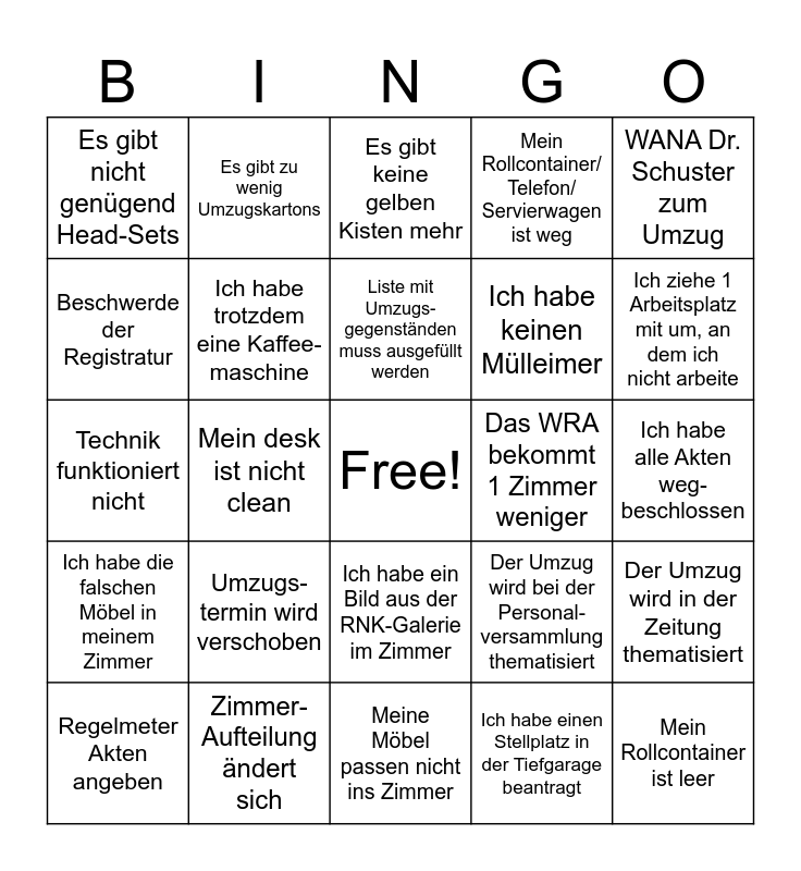 This bingo card has a free space and 24 words: Umzugs-termin wird verschoben, Zimmer-Aufteilung ändert sich, Liste mit Umzugs-gegenständen muss ausgefüllt werden, Regelmeter Akten angeben, WANA Dr. Schuster zum Umzug, Es gibt nicht genügend Head-Sets, Beschwerde der Registratur, Es gibt zu wenig Umzugskartons, Das WRA bekommt 1 Zimmer weniger, Ich habe ein Bild aus der RNK-Galerie im Zimmer, Ich habe keinen Mülleimer, Technik funktioniert nicht, Der Umzug wird bei der Personal-versammlung thematisiert, Der Umzug wird in der Zeitung thematisiert, Ich habe trotzdem eine Kaffee-maschine, Ich habe einen Stellplatz in der Tiefgarage beantragt, Ich habe alle Akten weg-beschlossen, Es gibt keine gelben Kisten mehr, Ich ziehe 1 Arbeitsplatz mit um, an dem ich nicht arbeite, Mein desk ist nicht clean, Mein Rollcontainer ist leer, Ich habe die falschen Möbel in meinem Zimmer, Mein Rollcontainer/ Telefon/ Servierwagen ist weg and Meine Möbel passen nicht ins Zimmer.