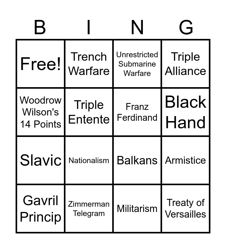 This bingo card has 16 words: Gavril Princip, Zimmerman Telegram, Unrestricted Submarine Warfare, Triple Alliance, Woodrow Wilson's 14 Points, Trench Warfare, Balkans, Armistice, Free!, Triple Entente, Militarism, Black Hand, Slavic, Nationalism, Franz Ferdinand and Treaty of Versailles.