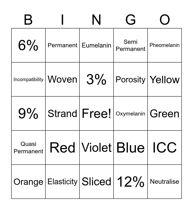 This bingo card has a free space and 24 words: Red, Elasticity, 3%, Orange, Pheomelanin, 6%, Incompatibility, Permanent, Oxymelanin, Violet, Porosity, 9%, Blue, ICC, Woven, 12%, Green, Eumelanin, Yellow, Strand, Neutralise, Quasi Permanent, Semi Permanent and Sliced.