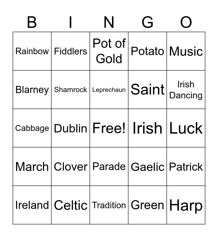 This bingo card has a free space and 24 words: Clover, Celtic, Leprechaun, Ireland, Music, Rainbow, Blarney, Fiddlers, Irish, Parade, Saint, Cabbage, Gaelic, Patrick, Shamrock, Green, Luck, Pot of Gold, Irish Dancing, Dublin, Harp, March, Potato and Tradition.