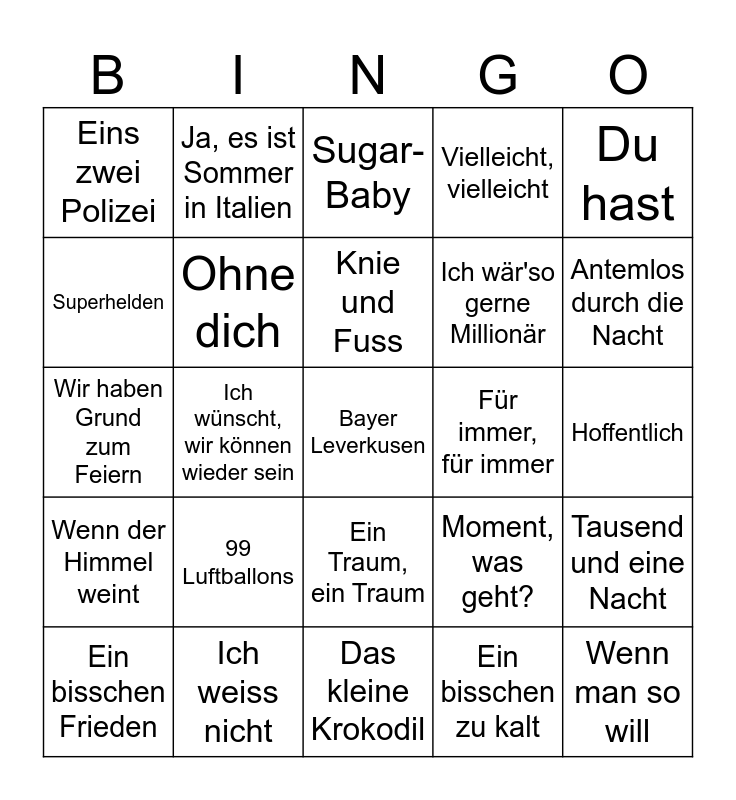 This bingo card has 25 words: 99 Luftballons, Das kleine Krokodil, Knie und Fuss, Ein bisschen Frieden, Du hast, Eins zwei Polizei, Superhelden, Ja, es ist Sommer in Italien, Für immer, für immer, Ein Traum, ein Traum, Ich wär'so gerne Millionär, Wir haben Grund zum Feiern, Moment, was geht?, Tausend und eine Nacht, Ohne dich, Wenn man so will, Hoffentlich, Sugar-Baby, Antemlos durch die Nacht, Ich wünscht, wir können wieder sein, Bayer Leverkusen, Ich weiss nicht, Wenn der Himmel weint, Vielleicht, vielleicht and Ein bisschen zu kalt.