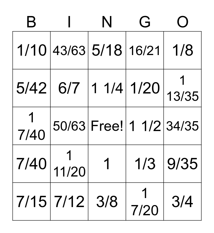 This bingo card has a free space and 24 words: 1 11/20, 7/12, 1 1/4, 7/15, 1/8, 1/10, 5/42, 43/63, 1 1/2, 1, 1/20, 1 7/40, 1/3, 9/35, 6/7, 1 7/20, 34/35, 5/18, 1 13/35, 50/63, 3/4, 7/40, 16/21 and 3/8.