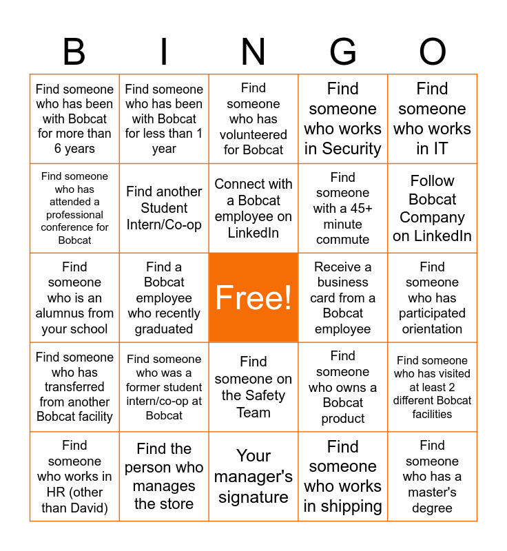 This bingo card has a free space and 24 words: Find someone who was a former student intern/co-op at Bobcat, Find the person who manages the store, Connect with a Bobcat employee on LinkedIn, Find someone who works in HR (other than David), Find someone who works in IT, Find someone who has been with Bobcat for more than 6 years, Find someone who has attended a professional conference for Bobcat, Find someone who has been with Bobcat for less than 1 year, Receive a business card from a Bobcat employee, Find someone on the Safety Team, Find someone with a 45+ minute commute, Find someone who is an alumnus from your school, Find someone who owns a Bobcat product, Find someone who has visited at least 2 different Bobcat facilities, Find another Student Intern/Co-op, Find someone who works in shipping, Find someone who has participated orientation, Find someone who has volunteered for Bobcat, Follow Bobcat Company on LinkedIn, Find a Bobcat employee who recently graduated, Find someone who has a master's degree, Find someone who has transferred from another Bobcat facility, Find someone who works in Security and Your manager's signature.
