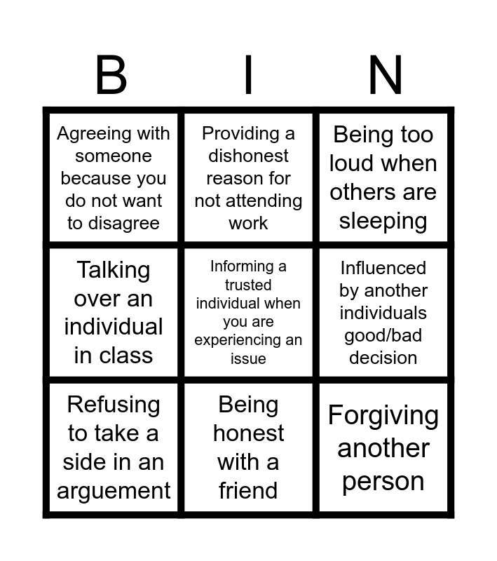 This bingo card has 10 words: Refusing to take a side in an arguement, Providing a dishonest reason for not attending work, Being too loud when others are sleeping, Talking over an individual in class, Informing a trusted individual when you are experiencing an issue, Forgiving another person, Agreeing with someone because you do not want to disagree, Being honest with a friend, Influenced by another individuals good/bad decision and Avoiding a conflicting situation.