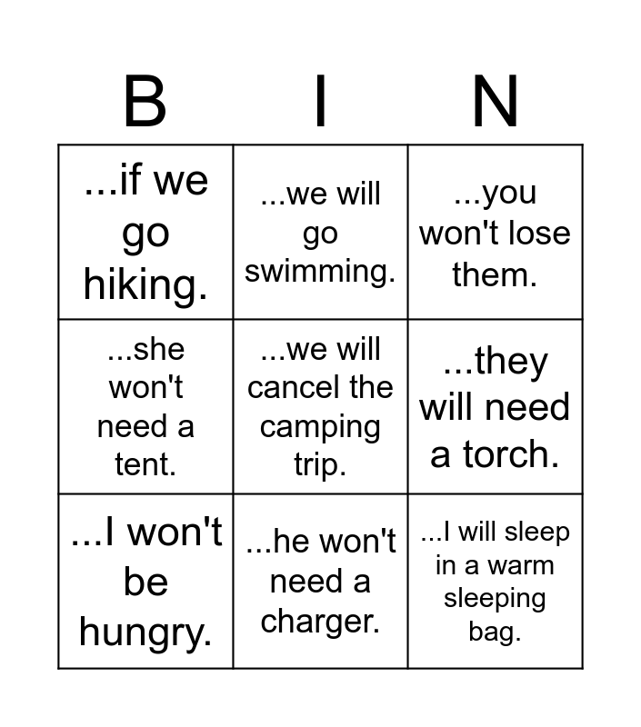 This bingo card has 12 words: ...she will walk away slowly., ...he won't need a charger., ...I will sleep in a warm sleeping bag., ...she won't need a tent., ...we will go swimming., ...they will need a torch., ...I won't be hungry., ...his hands will get cold., ...you won't lose them., ...if we go hiking., ...we will cancel the camping trip. and ...if she doesn't want to get lost..