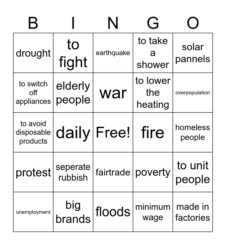 This bingo card has a free space and 30 words: big brands, climate change, daily, deforestation, drought, earthquake, elderly people, fairtrade, fire, floods, homeless people, made in factories, minimum wage, organic / green products, overpopulation, plastic bags, poverty, protest, seperate rubbish, solar pannels, to avoid disposable products, to close the tap, to fight, to lower the heating, to switch off appliances, to take a shower, to unit people, unemployment, war and workers.