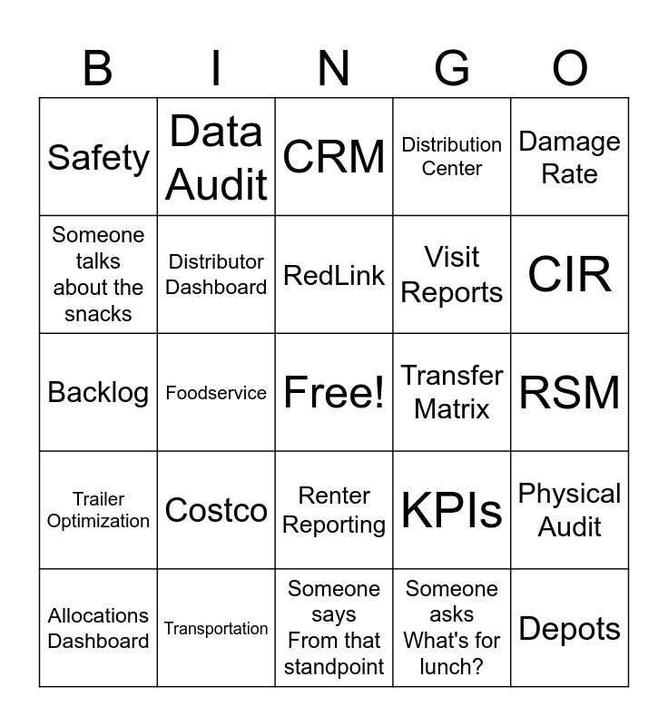 This bingo card has a free space and 70 words: CAPEX, RSM, Cube Utlization, RSMs, Transportation, Allocations, Distribution Center, Return Rate, Damage Rate, SAMs, Physical Audit, Signature Page, Safety, CRM, SharePoint, Foodservice, Renter Reporting, Visit Reports, Sharepoint, Trailer Optimization, Transfer Matrix, KPIs, CIR, Retail Types, Activity, Damage Playbook, Brainstorming, Someone asks What time's your flight?, Someone asks What's for lunch?, Corporate Management, Data Audit, We have an Icebreaker game, NPD, RedLink, Transfer Matrix, Someone complains about room temp, Distributor Expansion, Someone mentions the next break, Anyone's cell rings, Someone talks about the snacks, Target, Costco, Depots, Kroger, Walmart or Sam's, Distributor Dashboard, Allocations Dashboard, Someone says So...., Someone says Uh or Um 3 times in a presentation, Someone says "Real Quick", Core Values, Michael P says Cool Cool Cool, Account Level Matrix, Zone Captain, Someone says From that standpoint, Returns, RedLink, Open Returns Report, DC Performance Expectations, Site Visits, Backlog, McLane, Albertson's, Dollar General, Corporate Dashboard, Store Counts, KPI, Someone says You know?, Medium to Small Distributors and Location Manager.