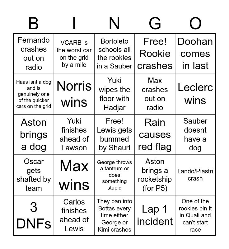 This bingo card has a free space and 24 words: Max wins, Carlos finishes ahead of Lewis, Yuki wipes the floor with Hadjar, 3 DNFs, Doohan comes in last, Fernando crashes out on radio, Haas isnt a dog and is genuinely one of the quicker cars on the grid, VCARB is the worst car on the grid by a mile, Rain causes red flag, George throws a tantrum or does something stupid, Max crashes out on radio, Aston brings a dog, Aston brings a rocketship (for P5), Lando/Piastri crash, Norris wins, Lap 1 incident, Sauber doesnt have a dog, Bortoleto schools all the rookies in a Sauber, Leclerc wins, Yuki finishes ahead of Lawson, One of the rookies bin it in Quali and can't start race, Oscar gets shafted by team, Free! Rookie crashes and They pan into Bottas every time either George or Kimi crashes.
