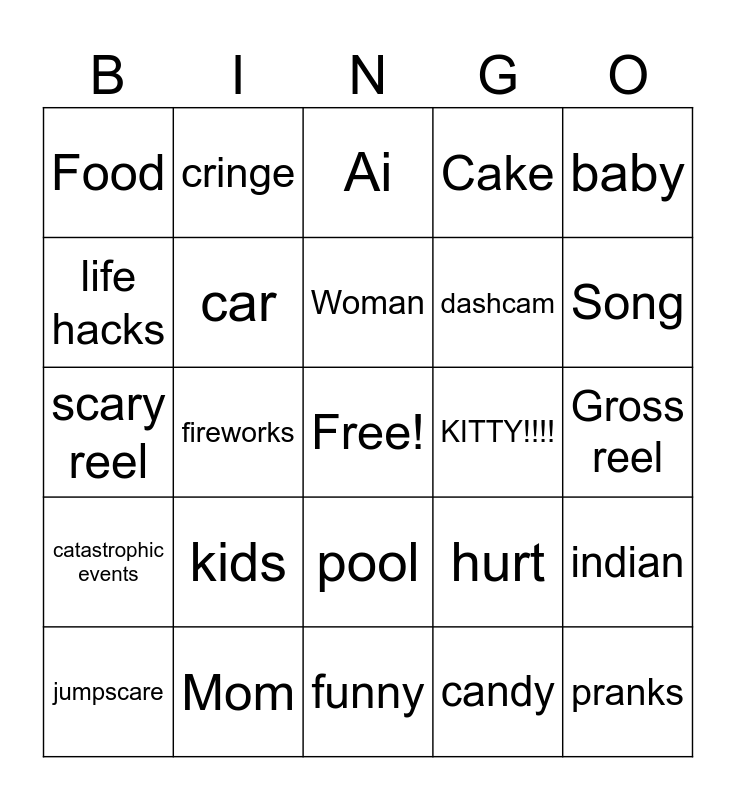 This bingo card has a free space and 24 words: kids, Mom, Woman, jumpscare, baby, Food, life hacks, cringe, KITTY!!!!, pool, dashcam, scary reel, hurt, indian, car, candy, Gross reel, Ai, Song, fireworks, pranks, catastrophic events, Cake and funny.