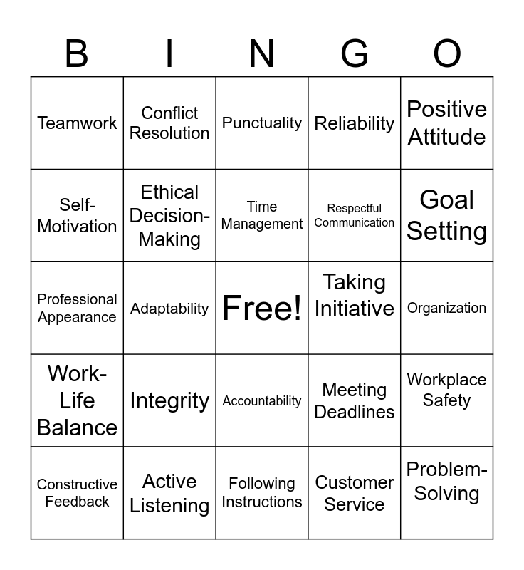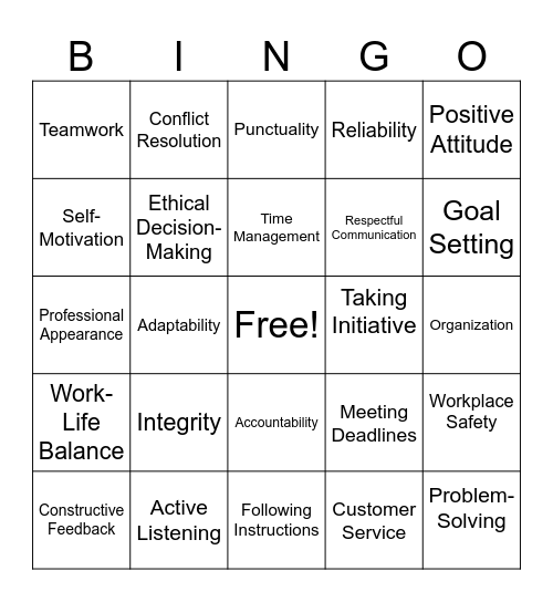 This bingo card has a free space and 24 words: Constructive Feedback, Integrity, Time Management, Customer Service, Positive Attitude, Teamwork, Conflict Resolution, Punctuality, Taking Initiative, Organization, Professional Appearance, Ethical Decision-Making, Meeting Deadlines, Workplace Safety, Self-Motivation, Active Listening, Following Instructions, Reliability, Goal Setting, Work-Life Balance, Adaptability, Accountability, Respectful Communication and Problem-Solving.