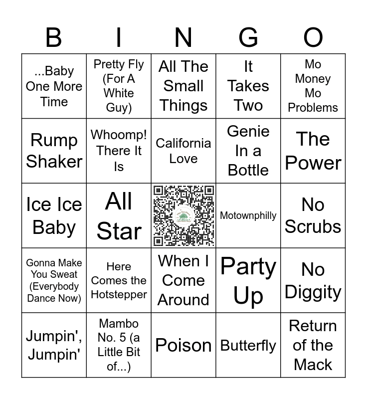 This bingo card has a free space and 42 words: Gangsta's Paradise, California Love, Hypnotize, Here Comes the Hotstepper, Butterfly, No Diggity, Return of the Mack, Smells Like Teen Spirit, All The Small Things, When I Come Around, No Scrubs, The Power, All Star, Mo Money Mo Problems, Semi-Charmed Life, Party Up, Fly Away, Ice Ice Baby, U Can't Touch This, Pretty Fly (For A White Guy), Rump Shaker, Fly - Fly, Enter Sandman, ...Baby One More Time, Buddy Holly, Loser, Genie In a Bottle, Jump, Hold My Hand, Just A Girl, Even Flow, Gonna Make You Sweat (Everybody Dance Now), Whoomp! There It Is, Poison, One Week, Jumpin', Jumpin', Mambo No. 5 (a Little Bit of...), Motownphilly, Give It Away, The Humpty Dance, It Takes Two and Fantasy.
