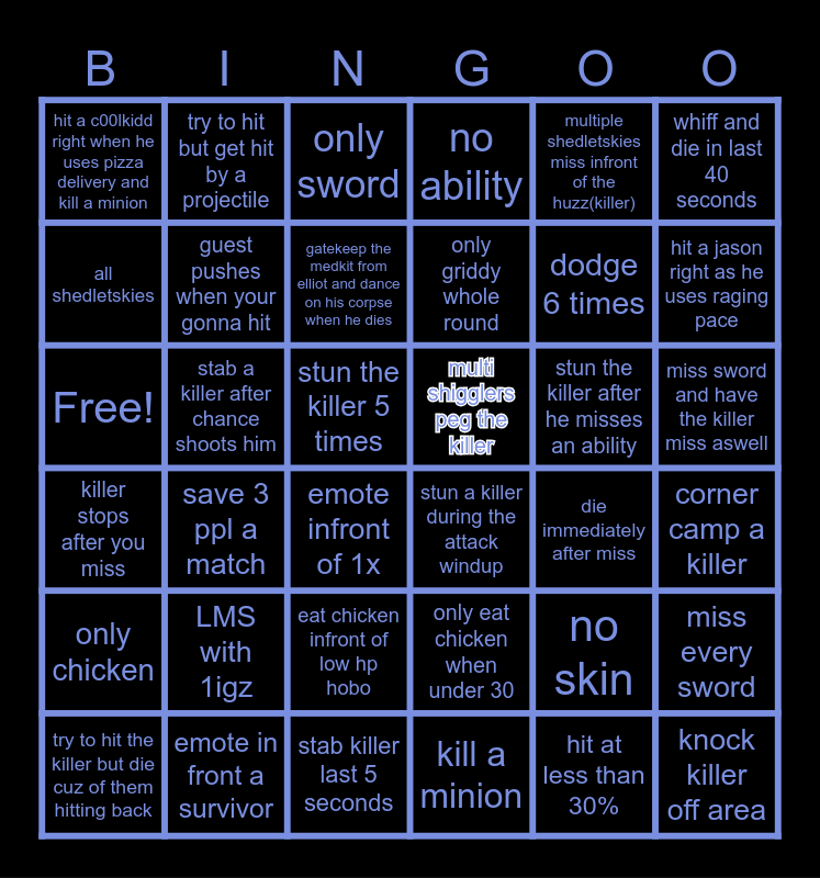 This bingo card has 36 words: only eat chicken when under 30, eat chicken infront of low hp hobo, kill a minion, all shedletskies, killer stops after you miss, multi shigglers peg the killer, guest pushes when your gonna hit, stab killer last 5 seconds, multiple shedletskies miss infront of the huzz(killer), no skin, hit a jason right as he uses raging pace, no ability, miss every sword, stab a killer after chance shoots him, only griddy whole round, hit a c00lkidd right when he uses pizza delivery and kill a minion, only chicken, stun the killer after he misses an ability, Free!, only sword, stun the killer 5 times, save 3 ppl a match, stun a killer during the attack windup, emote infront of 1x, die immediately after miss, try to hit but get hit by a projectile, dodge 6 times, emote in front a survivor, gatekeep the medkit from elliot and dance on his corpse when he dies, whiff and die in last 40 seconds, knock killer off area, try to hit the killer but die cuz of them hitting back, corner camp a killer, miss sword and have the killer miss aswell, LMS with 1igz and hit at less than 30%.