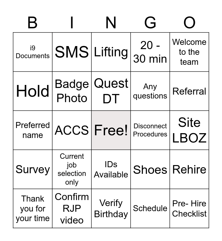 This bingo card has a free space and 24 words: Current job selection only, Confirm RJP video, Quest DT, Thank you for your time, Welcome to the team, i9 Documents, Hold, SMS, Disconnect Procedures, IDs Available, Any questions, Preferred name, Shoes, Rehire, Badge Photo, Schedule, Site LBOZ, Lifting, Referral, ACCS, Pre- Hire Checklist, Survey, 20 - 30 min and Verify Birthday.