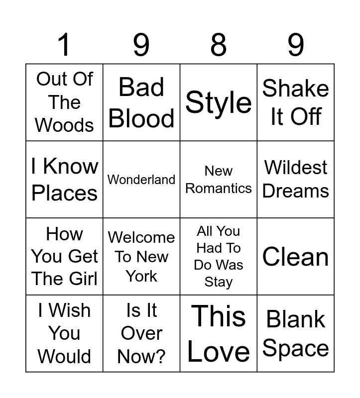 This bingo card has 18 words: Welcome To New York, Blank Space, Style, Out Of The Woods, All You Had To Do Was Stay, Shake It Off, I Wish You Would, Bad Blood, Wildest Dreams, How You Get The Girl, This Love, I Know Places, Clean, Wonderland, New Romantics, You Are In Love, Is It Over Now? and Now That We Don’t Talk.