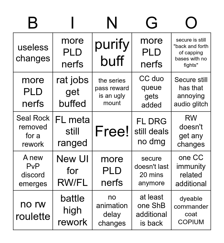 This bingo card has 1 images, a free space and 28 words: more PLD nerfs, battle high rework, purify buff, people still getting golfed somehow in secure, secure is still "back and forth of capping bases with no fights", useless changes, rat jobs get buffed, the series pass reward is an ugly mount, FL DRG still deals no dmg, one CC immunity related additional, no rw roulette, FL meta still ranged, at least one ShB additional is back, dyeable commander coat COPIUM, Seal Rock removed for a rework, old series rewards are back, no animation delay changes, secure doesn't last 20 mins anymore, Secure still has that annoying audio glitch, A new PvP discord emerges, New UI for RW/FL, CC duo queue gets added, RW doesn't get any changes, more PLD nerfs, more PLD nerfs, more PLD nerfs, more PLD nerfs and more PLD nerfs.