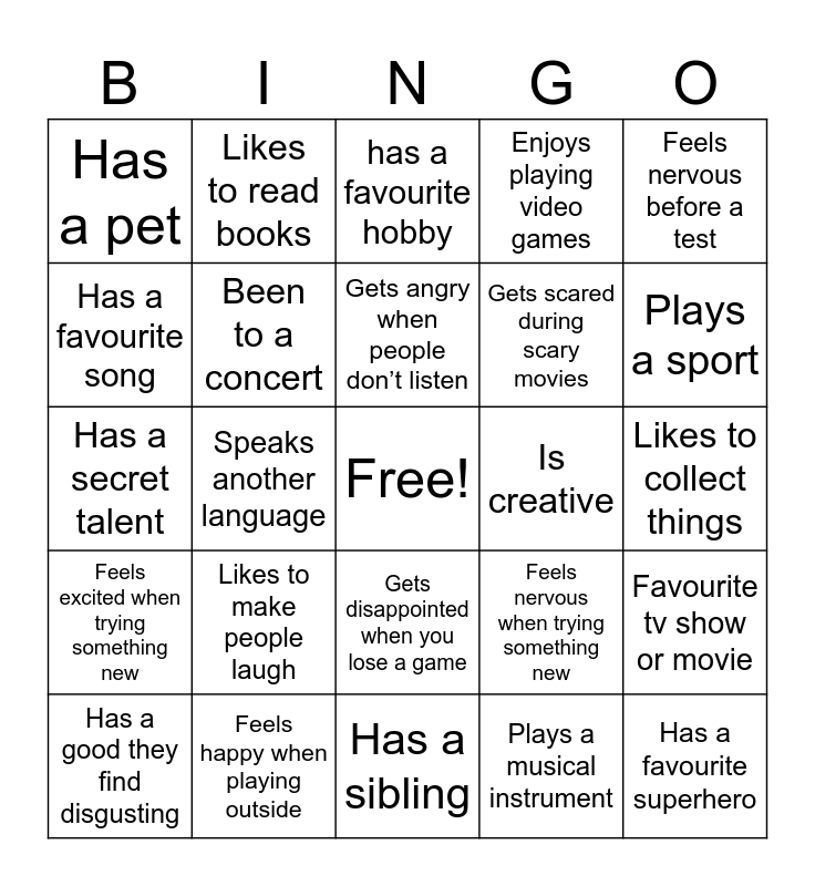 This bingo card has a free space and 24 words: Likes to make people laugh, Feels happy when playing outside, Gets angry when people don’t listen, Has a good they find disgusting, Feels nervous before a test, Has a pet, Has a favourite song, Likes to read books, Is creative, Gets disappointed when you lose a game, Gets scared during scary movies, Has a secret talent, Feels nervous when trying something new, Favourite tv show or movie, Been to a concert, Plays a musical instrument, Likes to collect things, has a favourite hobby, Plays a sport, Speaks another language, Has a favourite superhero, Feels excited when trying something new, Enjoys playing video games and Has a sibling.